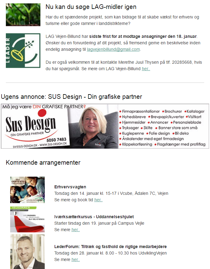 Bliv annoncør i UdviklingVejens ugentlige nyhedsmail og få eksponering over for ca. 890 modtagere, som består af lokale virksomheder, pressen, politikere og andre interessenter.